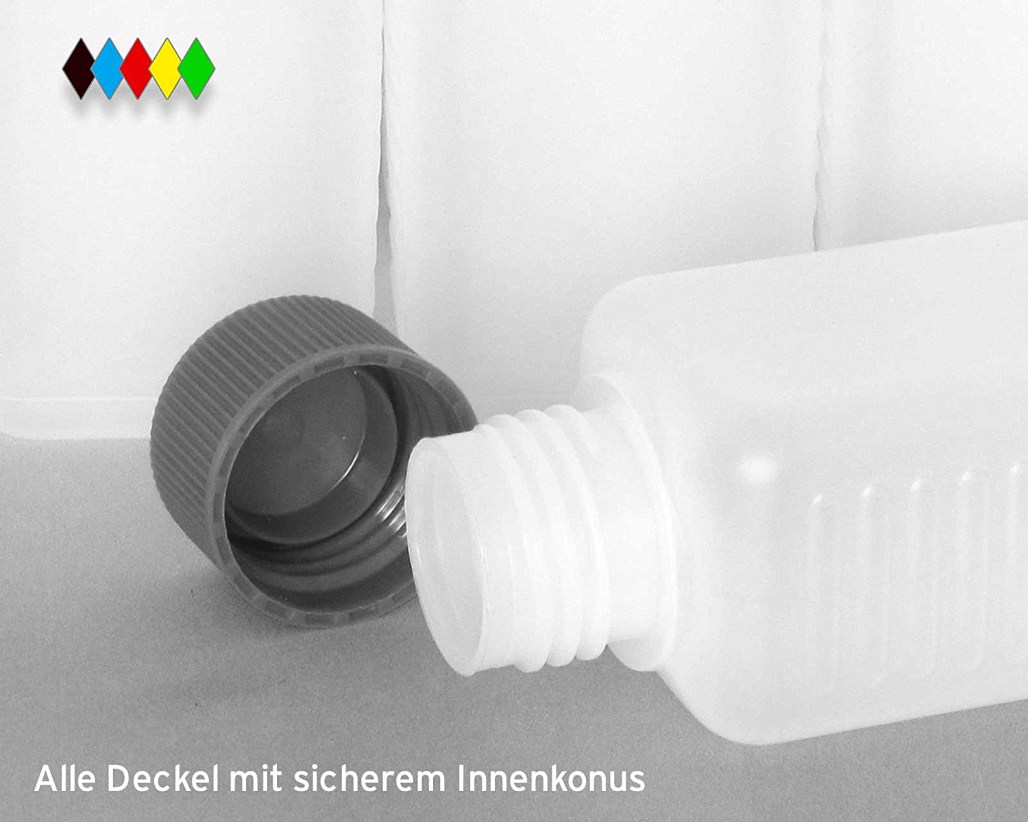 5 Plastikflaschen 1.000 ml eckig aus HDPE mit farbigen Schraubverschlüssen