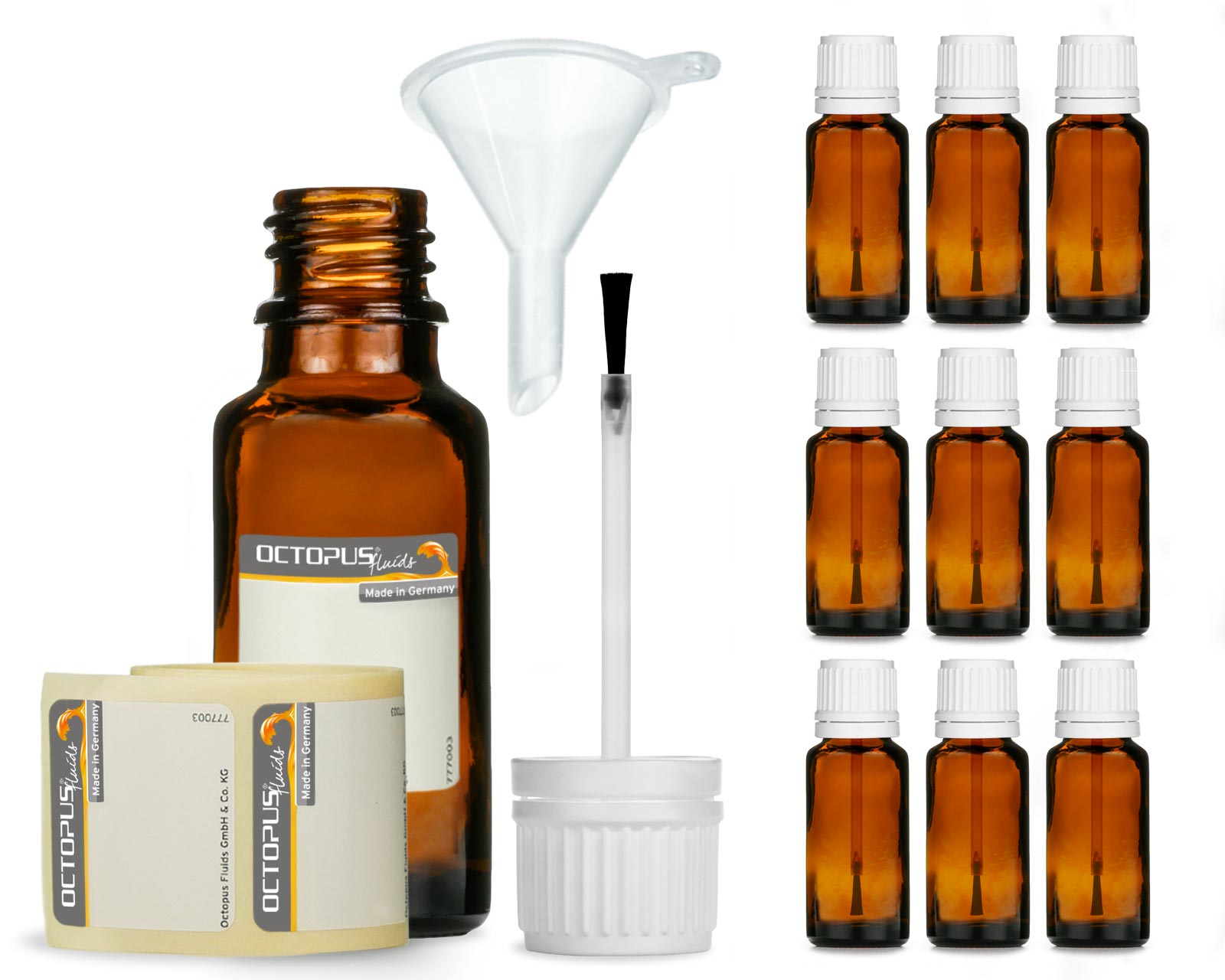10 x 20 ml Braunglasflasche mit Pinsel, Pinselverschluss, Originalitätsring und Mini-Trichter