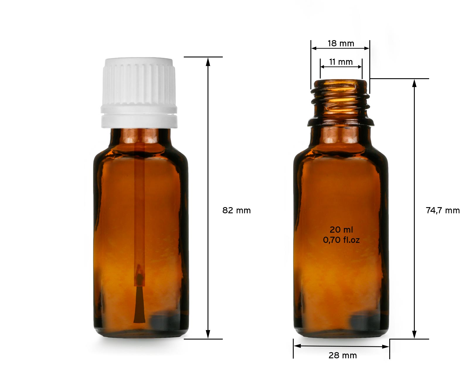 - 20 ml - Apothekerflasche aus Braunglas, lebensmittelecht, Gewinde GL18, hydrolytische Klasse 3 (Typ III), Durchmesser: 28 mm, Höhe: 74,7 mm, Gewicht: 33 g, ohne UN-Zulassung