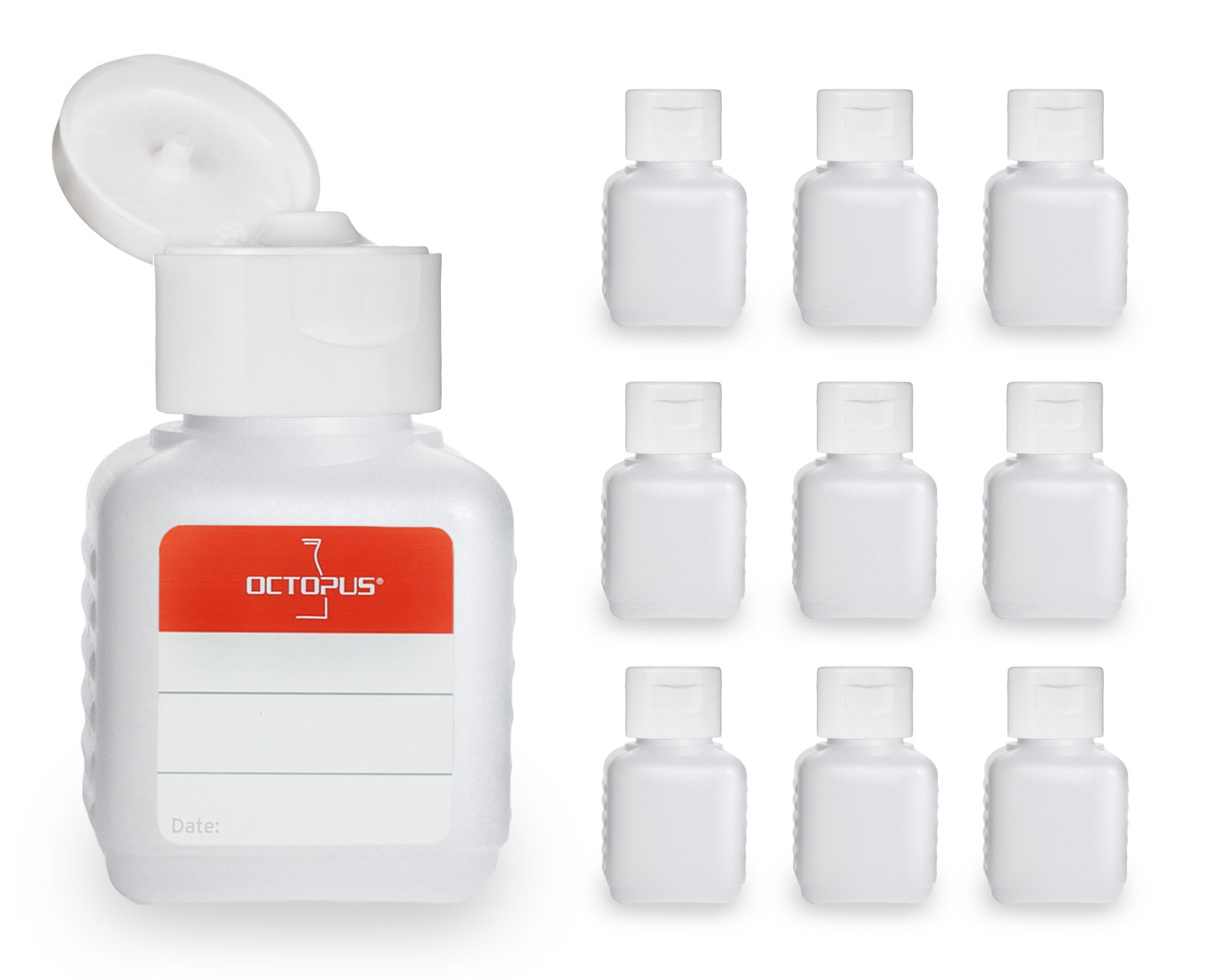 Eigenschaften: "10 x 50 ml Plastikflaschen aus HDPE mit weißen Klappverschlüssen"