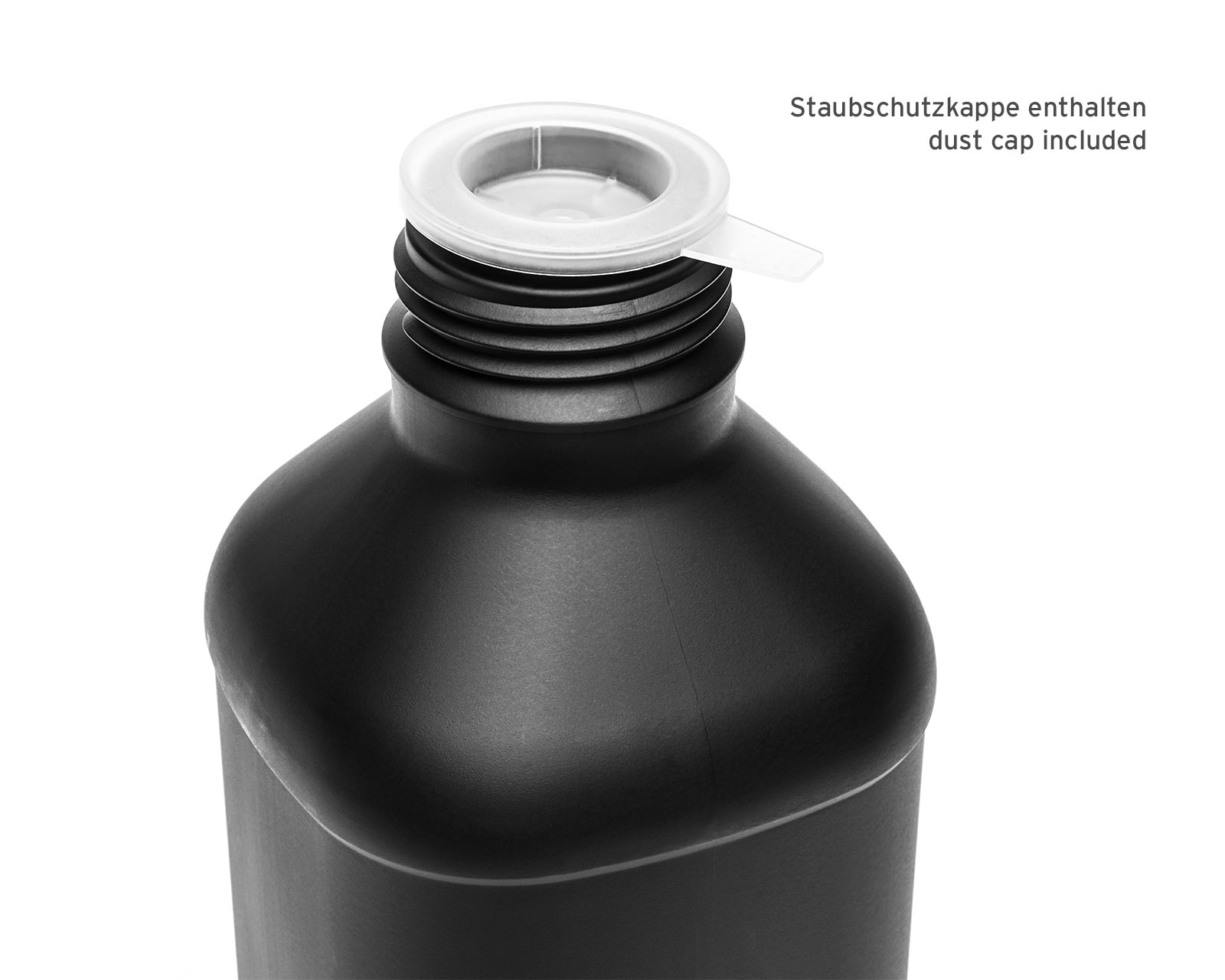 1000 ml lichtdichte UN-Gefahrgutflasche schwarz, 45 mm Gewinde aus HDPE mit Staubschutzkappe