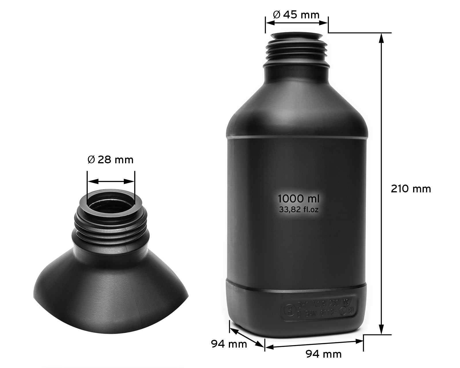 Eigenschaften: "1000 ml lichtdichte UN-Gefahrgutflasche schwarz, 45 mm Gewinde aus HDPE mit Staubschutzkappe"