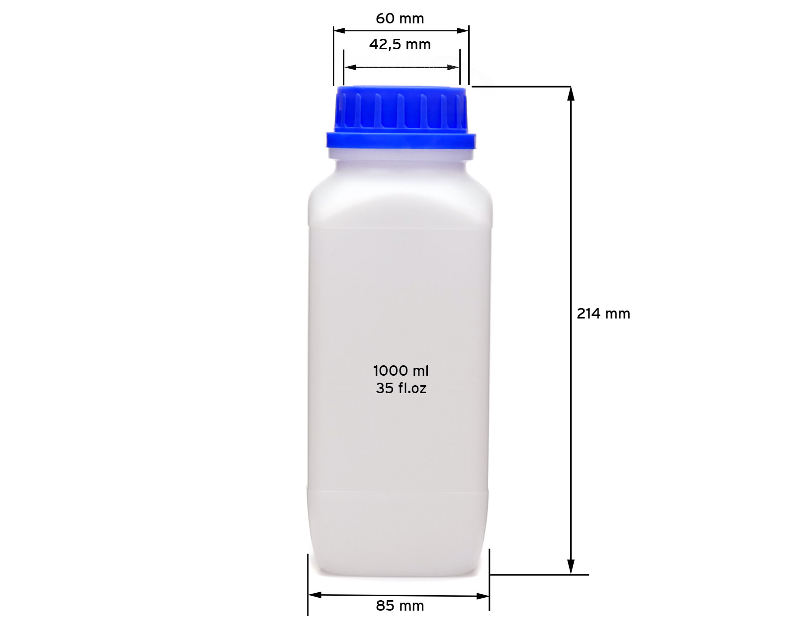 Die sehr stabile, HDPE Chemikalienflasche verfügt über einen sicheren, blauen Schraubdeckel-Verschluss aus PP mit Innenkonus. Der Innenkonus sorgt für hohe Abdichtung zwischen Flasche und Deckel.