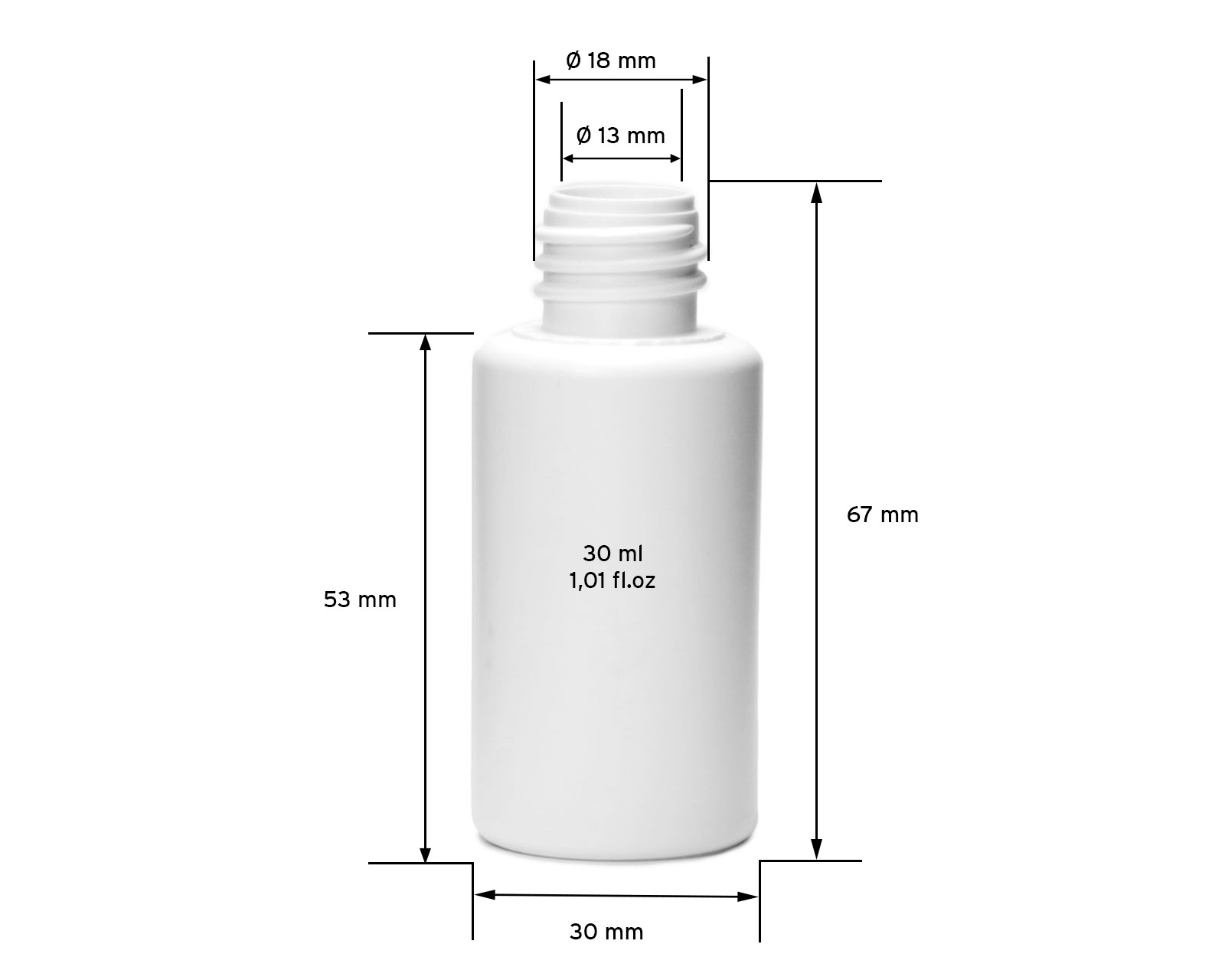 Eigenschaften: "30 ml weiße Plastikflasche aus HDPE mit 18 mm Gewinde"
