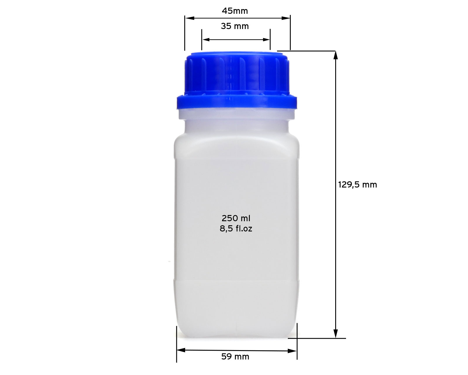 250 ml Weithals-Flasche mit blauem Schraubverschluß, UN-Zulassung und Beschriftungsetiketten