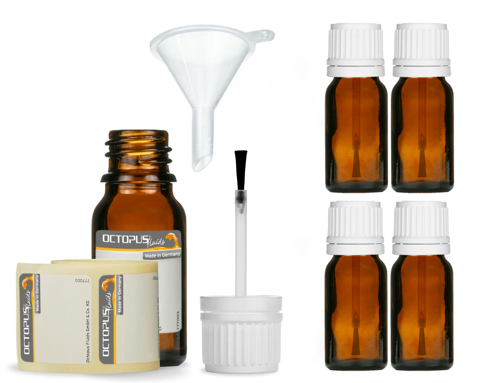 Das OCTOPUS Braunglasflaschen-Set (10 ml) mit montierten Pinsel und Mini-Trichter zum einfachen Befüllen der Flaschen ist ideal geeignet für zum Beispiel Nagellack, Farbe, Kleber und vieles mehr.