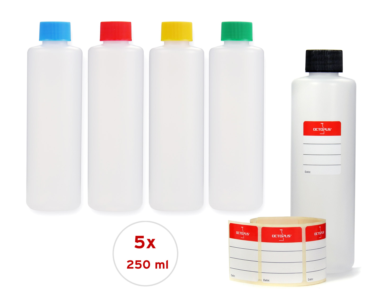 5 x 250 ml runde Plastikflaschen aus HDPE mit bunten Schraubverschlüssen, inkl. 5 Beschriftungsetiketten
