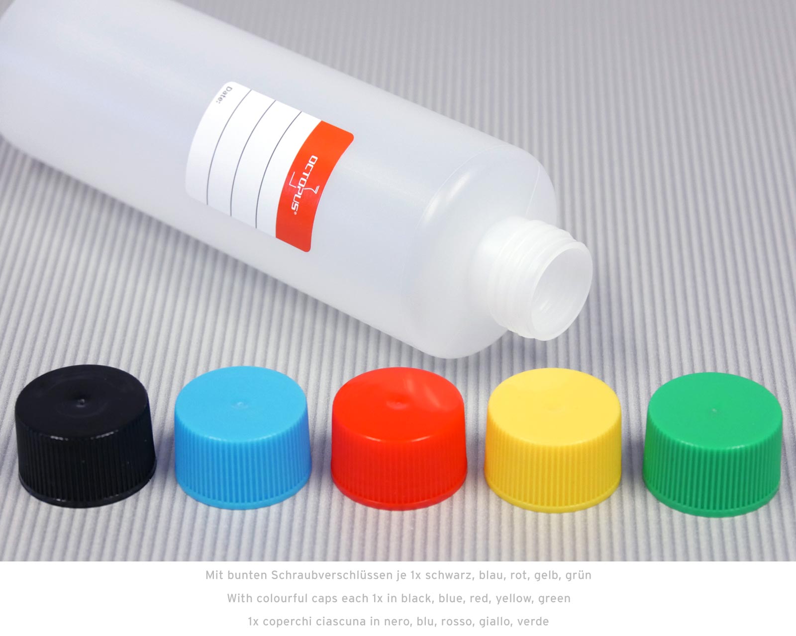 - Bunte Schraubverschlüsse: je 1x schwarz, blau, rot, gelb, grün