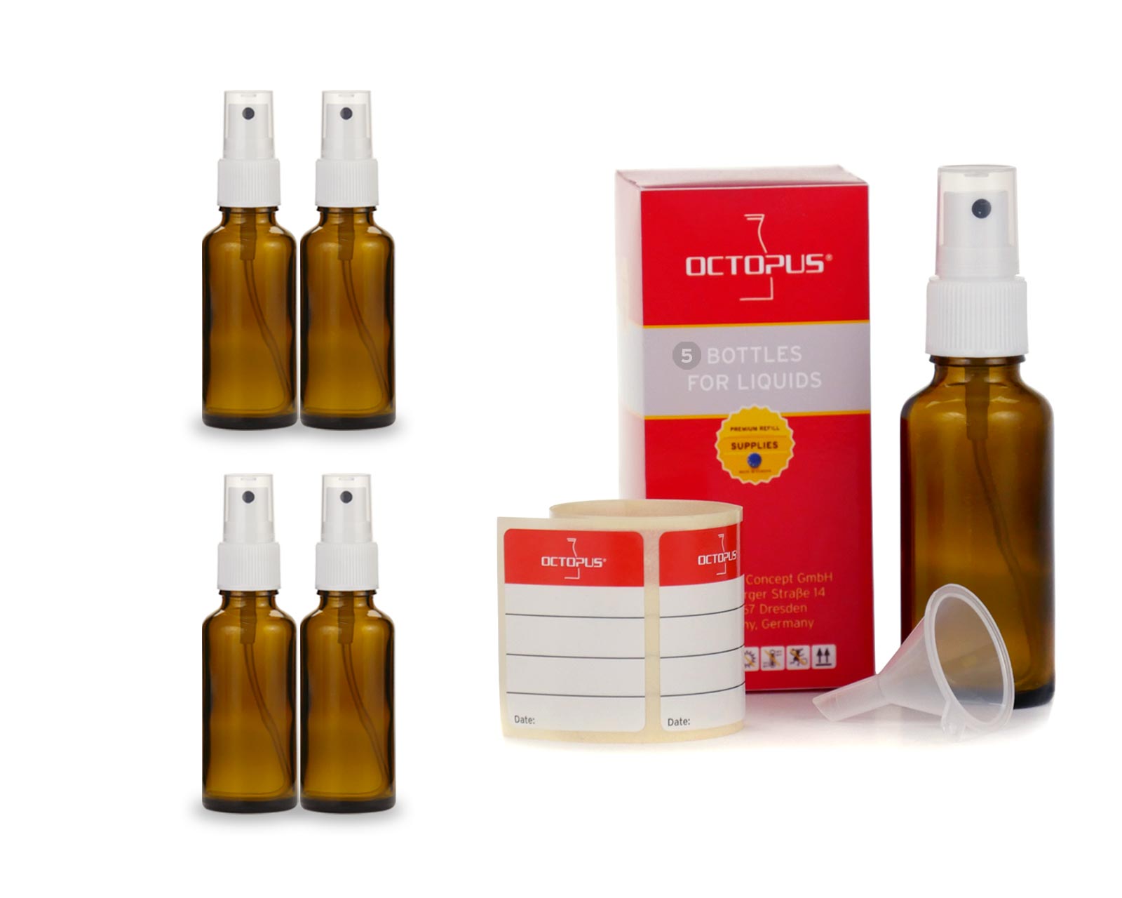 5 x 30 ml Braunglasflaschen mit Fingerzerstäubern und Mini-Trichter, inkl. 5 Beschriftungsetiketten