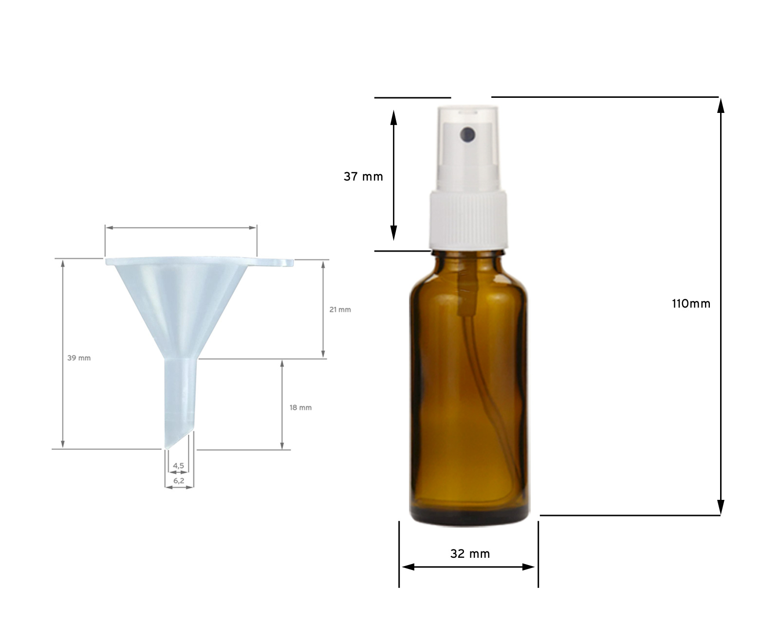 Eigenschaften: "5 x 30 ml Braunglasflaschen mit Fingerzerstäuber + Trichter"