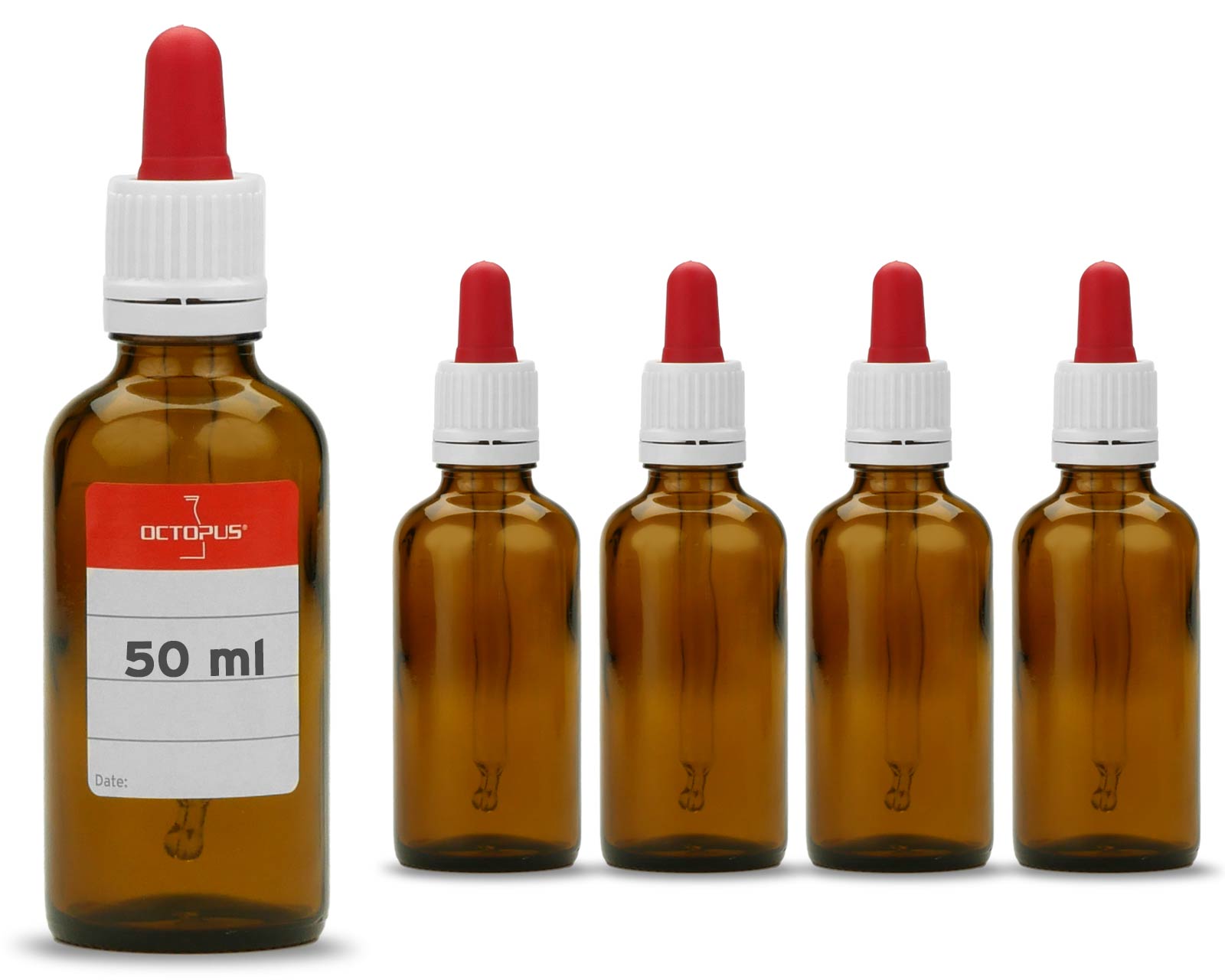 5 x 50 ml Pipettenflaschen aus Braunglas mit Glaspipetten, inkl. 5 Beschriftungsetiketten