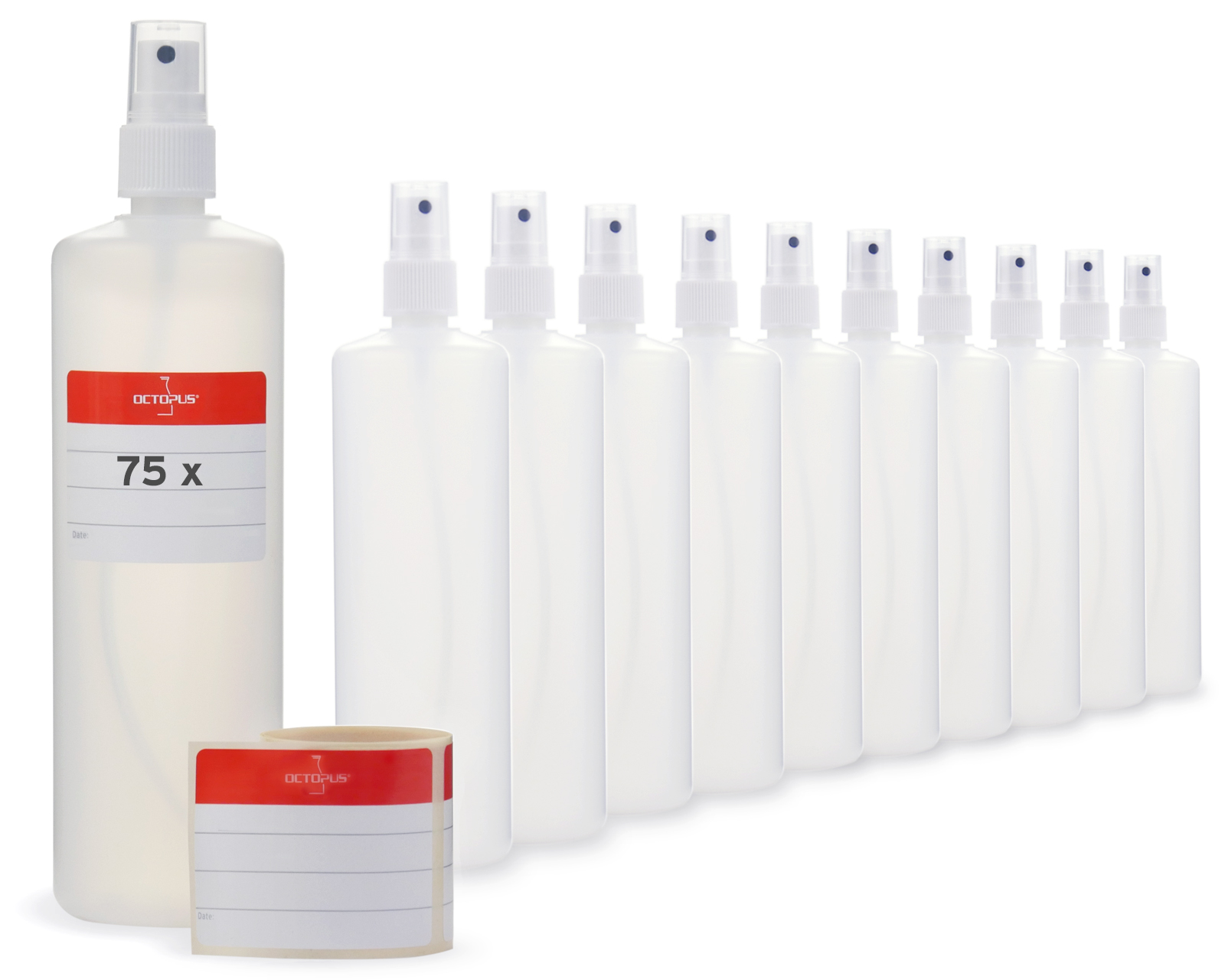75 x 250 ml Plastikflaschen aus HDPE mit Fingerzerstäuber und Überkappe, inkl. 75 Beschriftungsetiketten