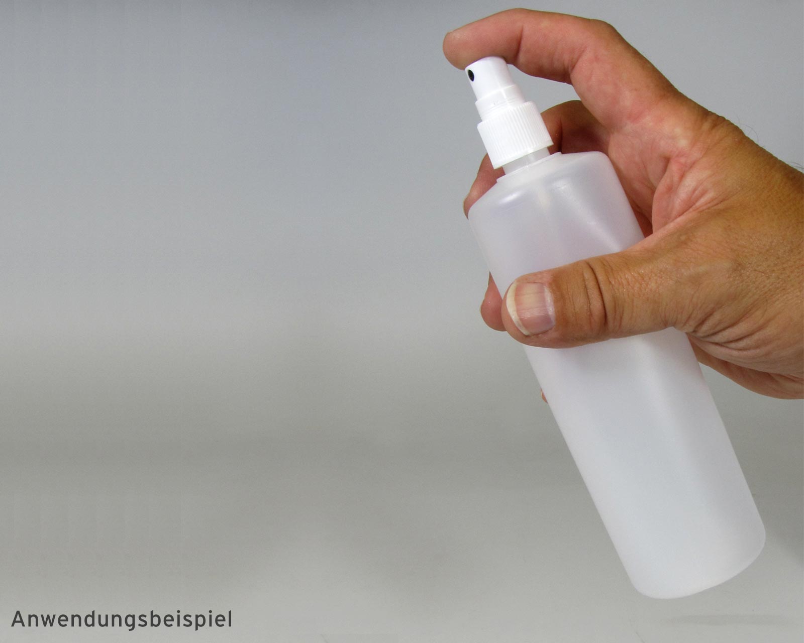 Eigenschaften: "75 Plastikflaschen 250 ml aus HDPE, natur, G18, Fingerzerstäuber aus PP, weiß, klare Überkappe"