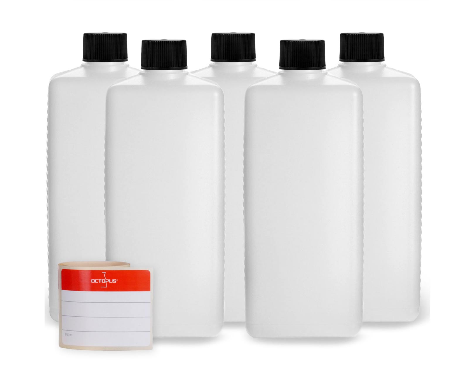 5 Leerflaschen (500 ml) mit schwarzen Deckeln, inklusive 5 Beschriftungsetiketten.