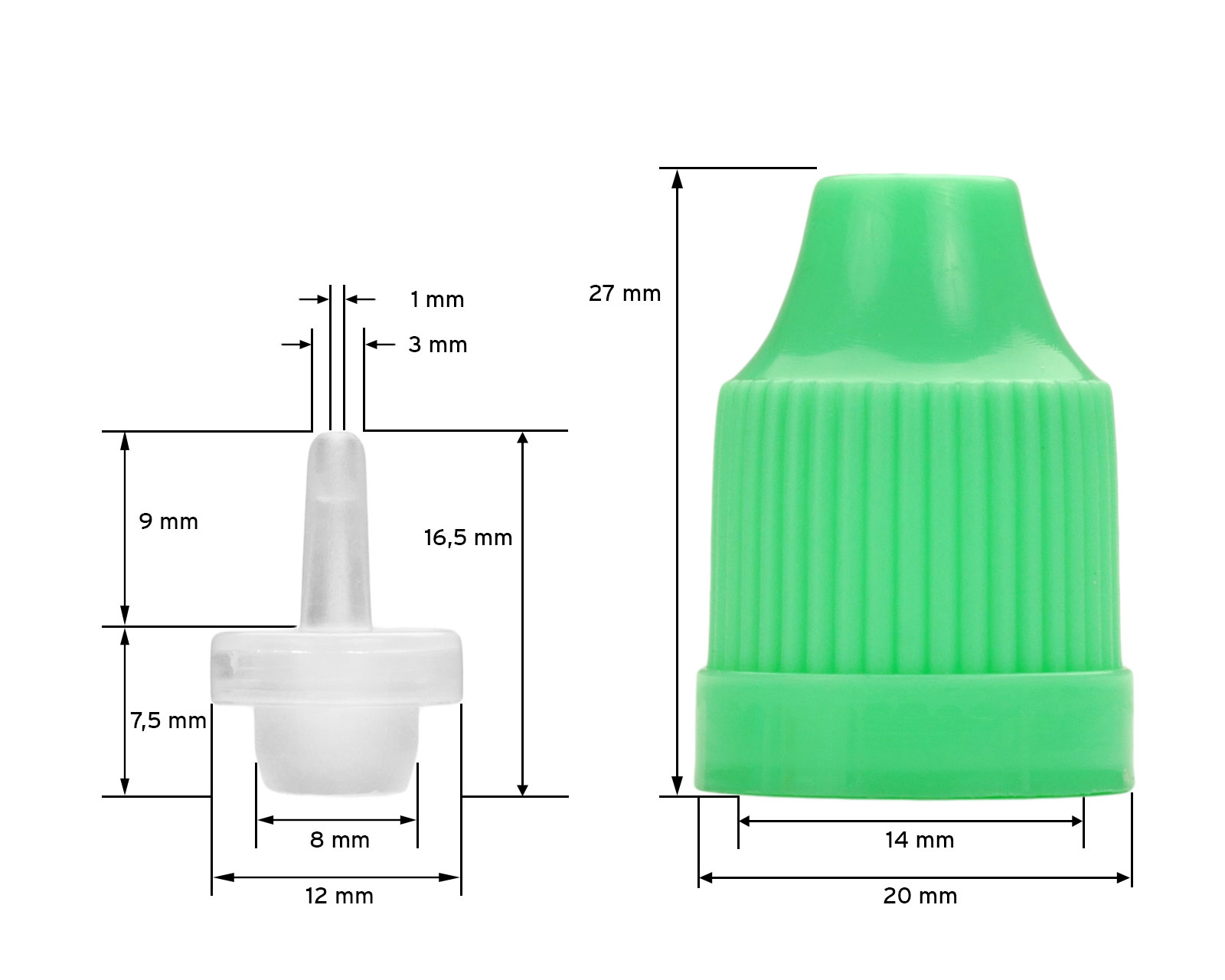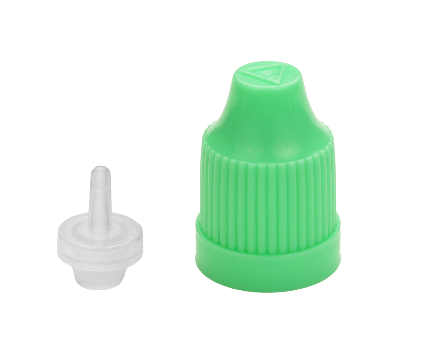 Drück & Dreh Schraubverschluss mit Kindersicherung in grün mit Tropfeinsatz für die tropfenweise Dosierung unterschiedlichster Flüssigkeiten, z.B. E-Liquids, Augentropfen, Lebensmittel, Farben, Klebstoffe, u.v.m.