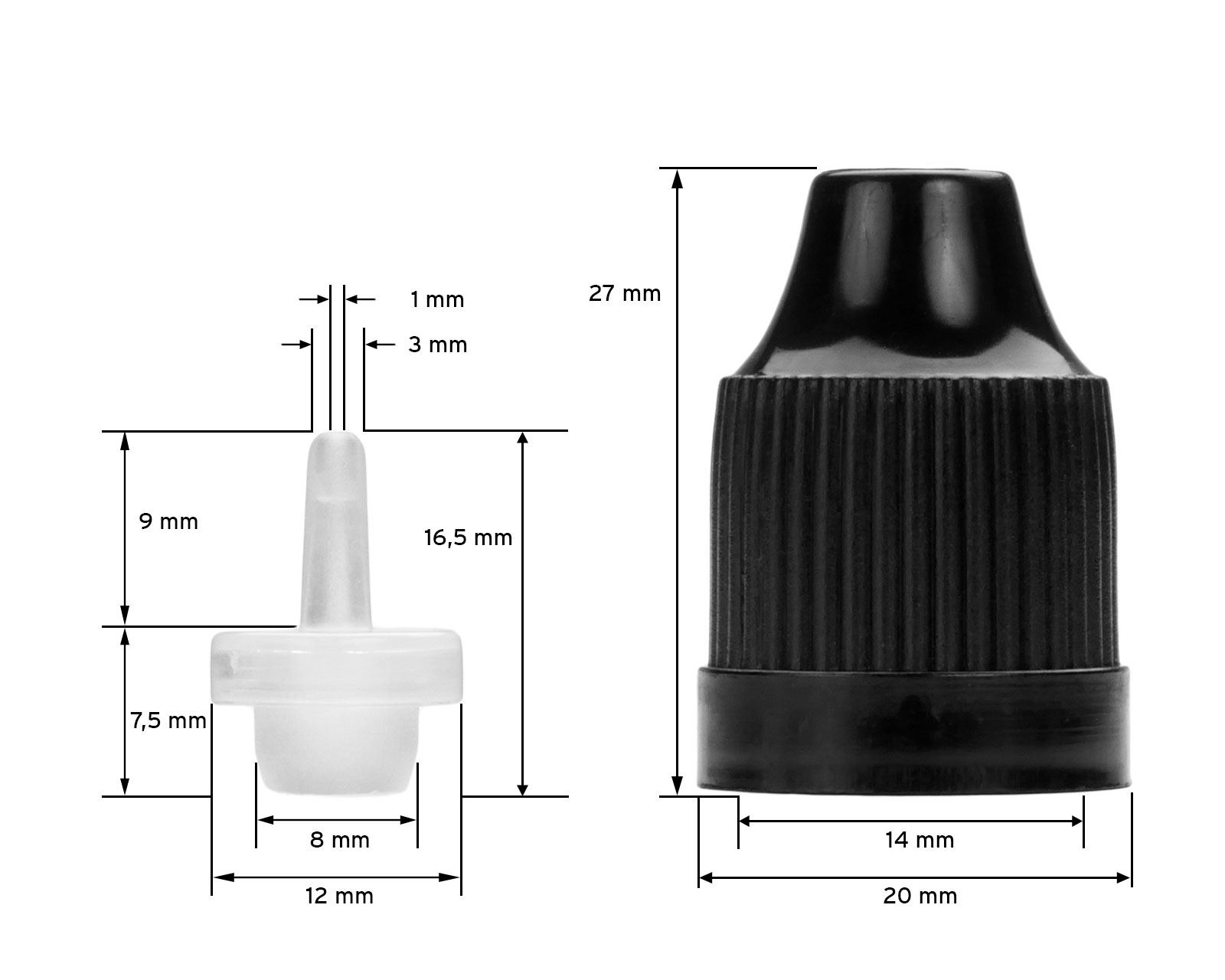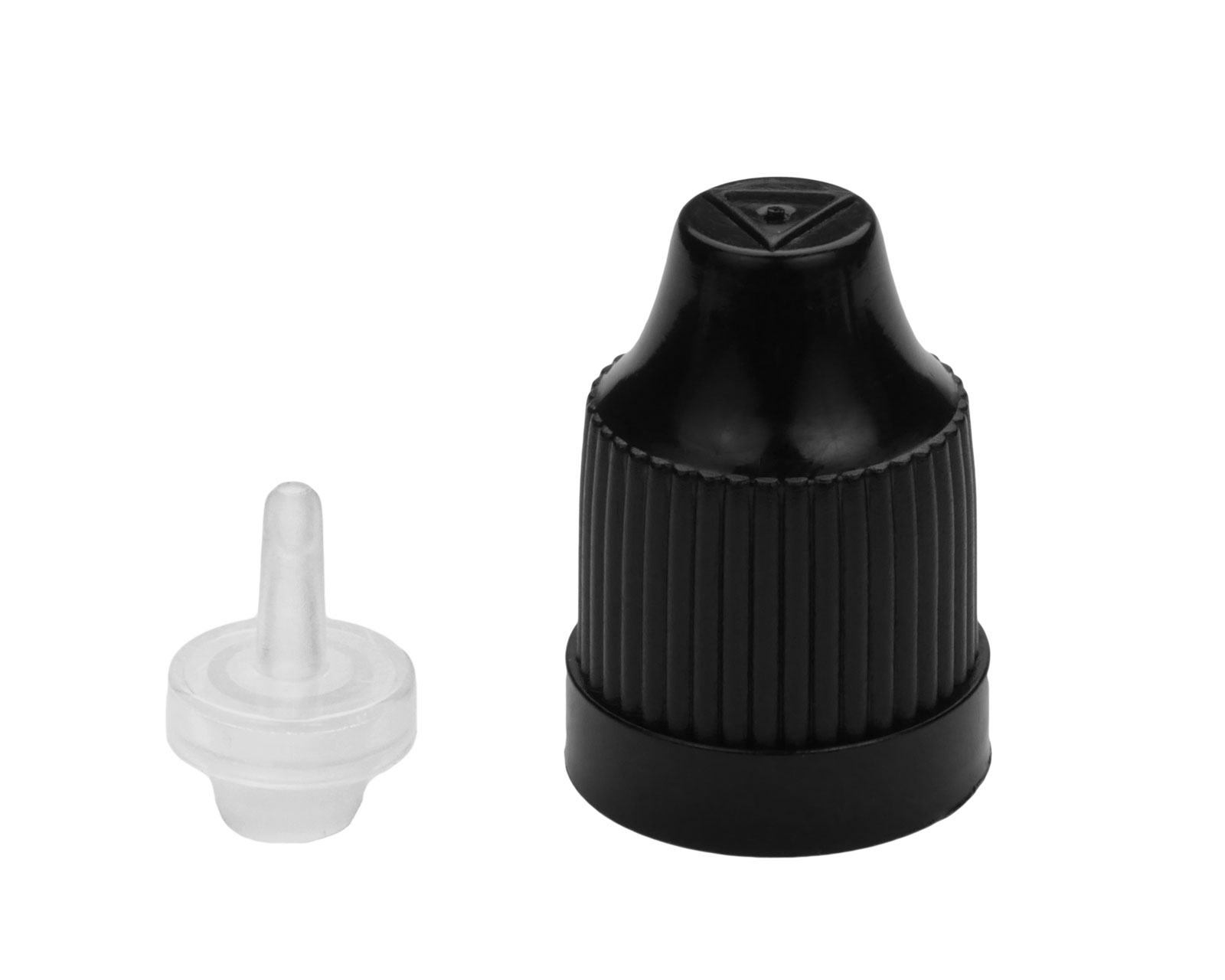 Drück & Dreh Schraubverschluss mit Kindersicherung in schwarz mit Tropfeinsatz für die tropfenweise Dosierung unterschiedlichster Flüssigkeiten, z.B. E-Liquids, Augentropfen, Lebensmittel, Farben, Klebstoffe, u.v.m.