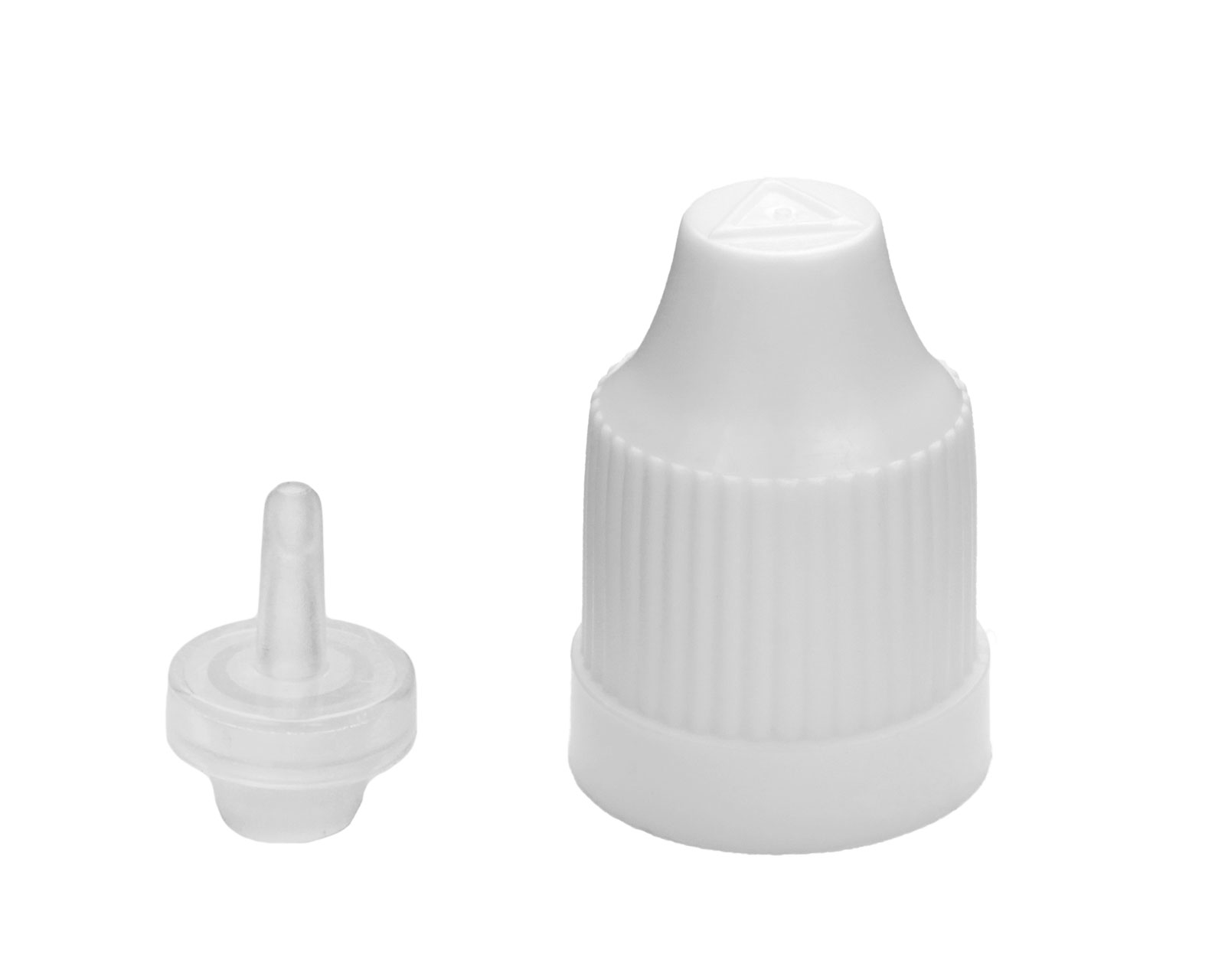 Drück & Dreh Schraubverschluss mit Kindersicherung in weiß mit Tropfeinsatz für die tropfenweise Dosierung unterschiedlichster Flüssigkeiten, z.B. E-Liquids, Augentropfen, Lebensmittel, Farben, Klebstoffe, u.v.m.