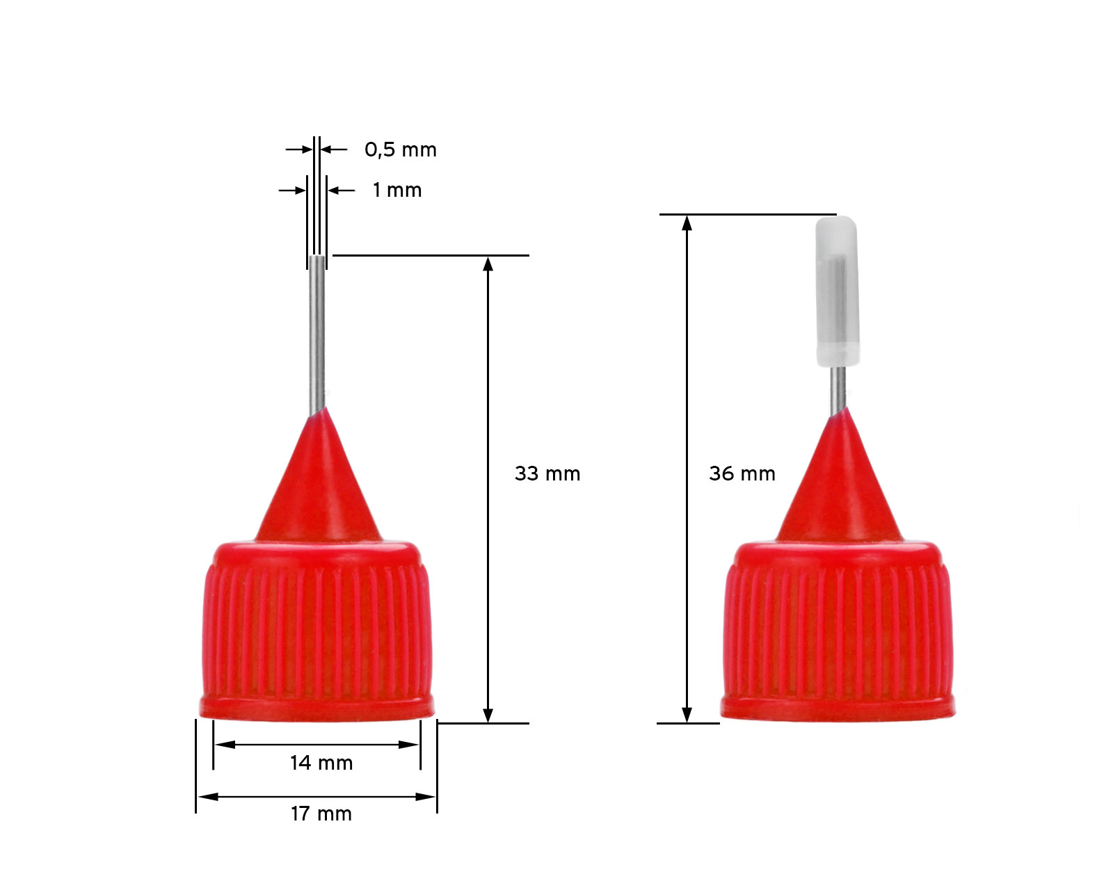 Anwendungsbeispiel: In Verbindung mit unseren Plastikflaschen aus weichem LDPE mit 14 mm Gewinde. Zur feinsten Dosierung unterschiedlichster Flüssigkeiten wie E-Liquids, Öle, Klebstoffe, Farben, Glitzer (Nail Art) und Glasuren.